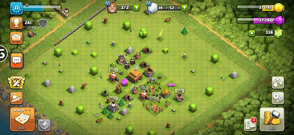 村庄的建造布局至关重要,它能切实有效地守护自身资源与奖杯。低本阶段,建筑物数量有限,闲暇之时不妨自行摆弄阵型,这有助于深入了解自己的村庄。常见的布局方式有:将大本营与资源放置在内,外围环绕一层防御建筑,再围上一圈围墙,把收集器设置在外侧,等等。(喏,这就是我的小村庄,哈哈哈哈,实在懒得摆阵,就随意弄成这样了 )