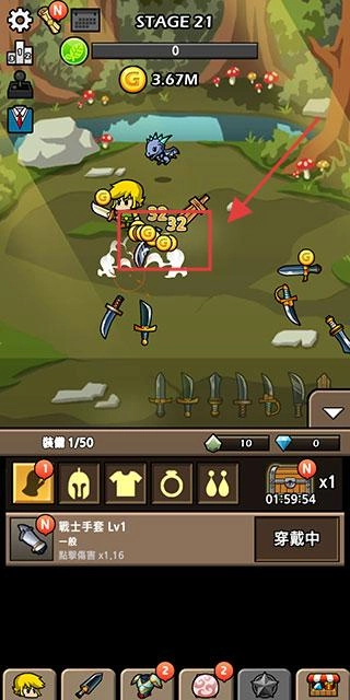 3、【STAGE21】战斗获取金币后,可购买勇士手套之类的装备,以此提升角色属性,增强【BladeCrafter2】的战斗能力。