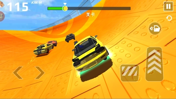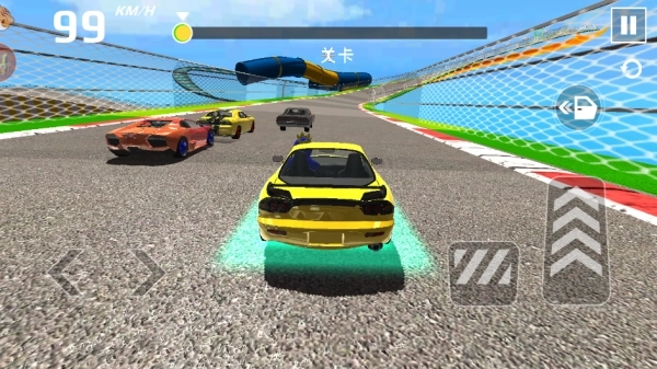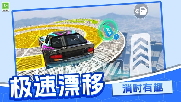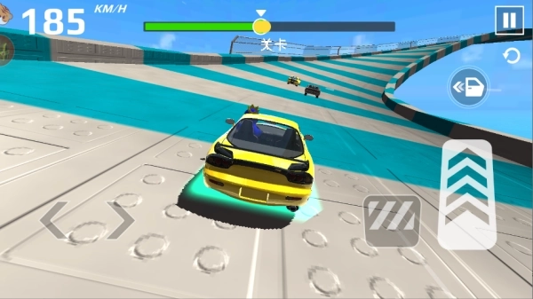 1、进入游戏后选择赛车,在特技赛道上驾驶,借助虚拟按键操控油门、刹车与转向,完成漂移动作。