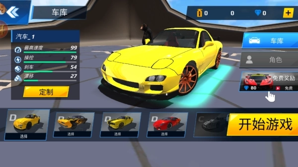 1、在自家车库里挑选心仪的车辆,后续性能强劲的超跑需完成解锁才能使用。