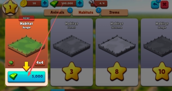 1、第一步得先花金币解锁一块土地,之后就可以着手开展你的动物园建造工作了。
