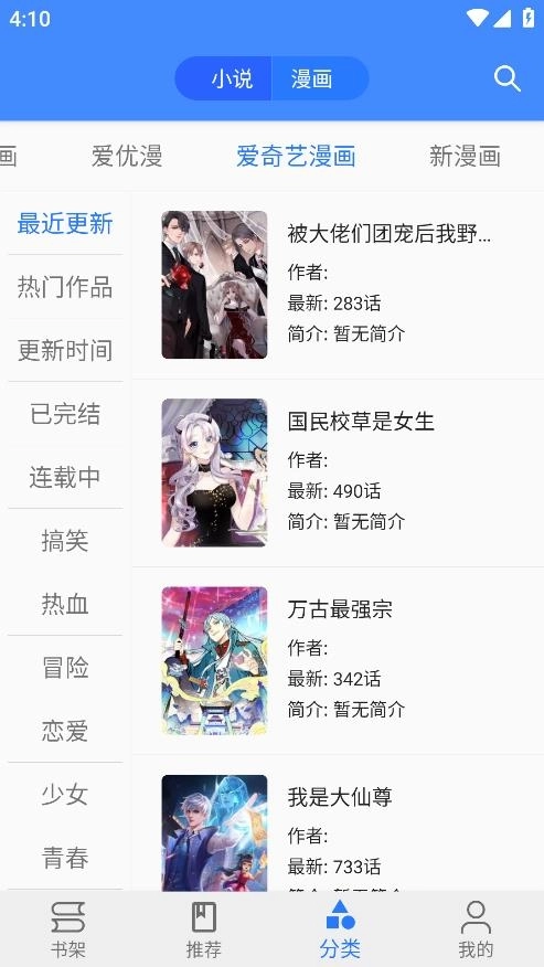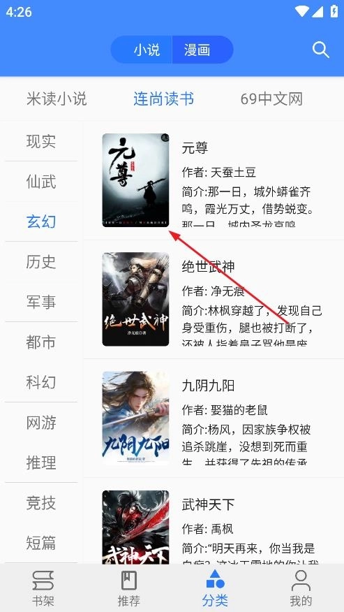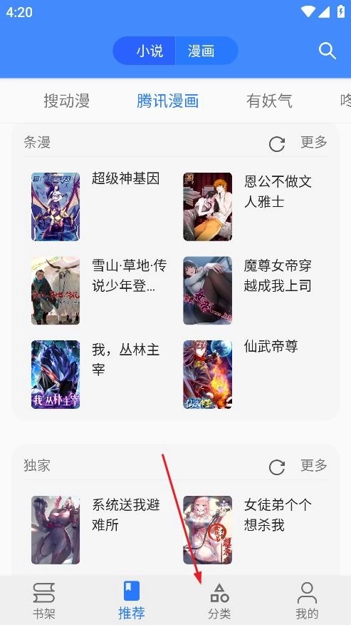 2.然后将上方的“小说/漫画”切换成小说。