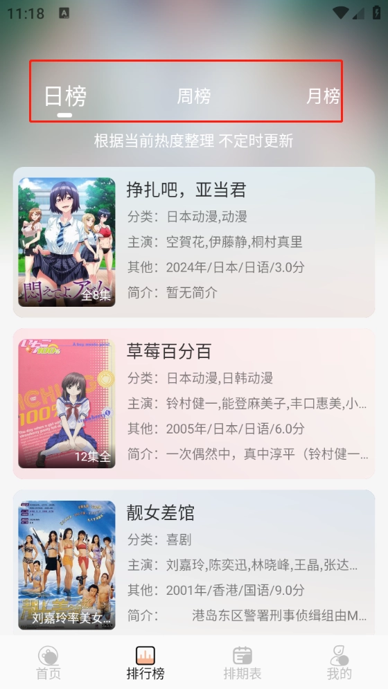 排行榜板块设有日榜、周榜和月榜,能帮助用户快速找到当前热门的动漫资源。